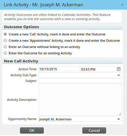 - Create a new 'Call' Activity, mark it done and enter the Outcome: This option is useful if an unscheduled phone call is conducted with a contact. It creates a Call-type calendar activity, marks it Done and opens the Activity Outcome Wizard. After selecting this option, enter the details of the call in the New Call Activity section. This section also contains an Opportunity Name drop-down list if the user has a SmartOpportunities license; select an opportunity to link to the new activity if appropriate.
