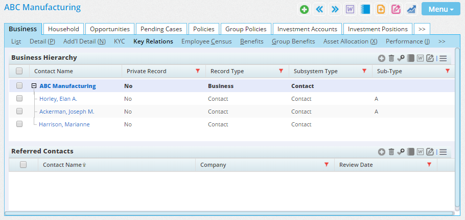 When a business is added to the hierarchy, a corresponding entry is created in that business' Business Hierarchy. When a contact is added to the hierarchy, the contact's Key Relations content link (specifically, the Business Relations section) reflects that relationship.