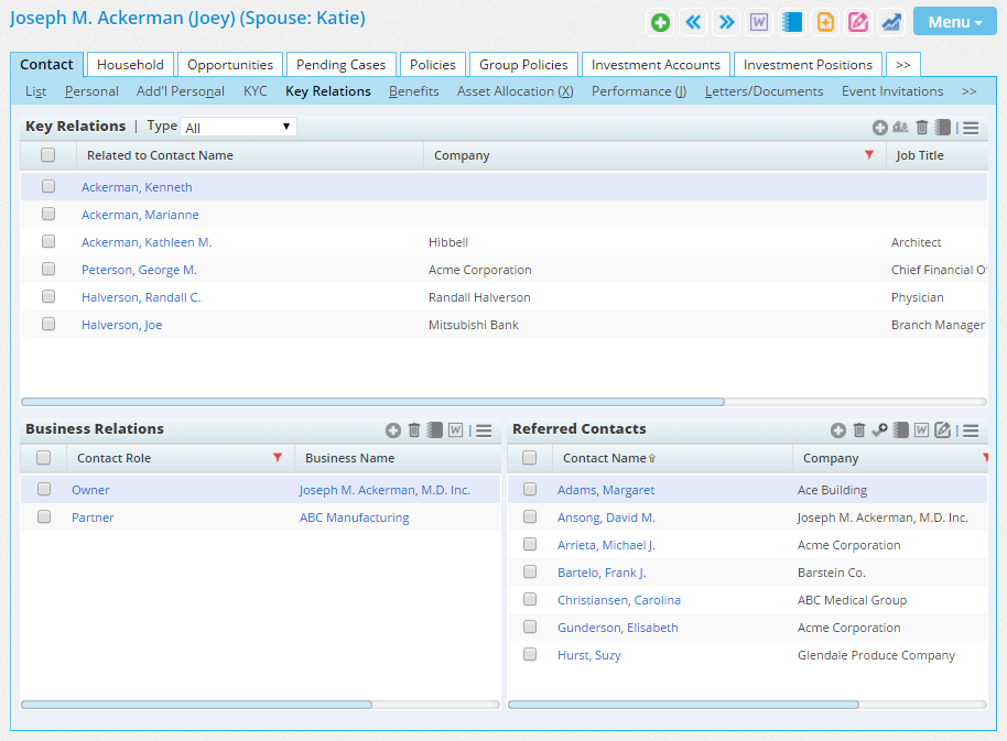 In contact records, the Key Relations section lists the contact's spouse, children, business associates and other relationships.
