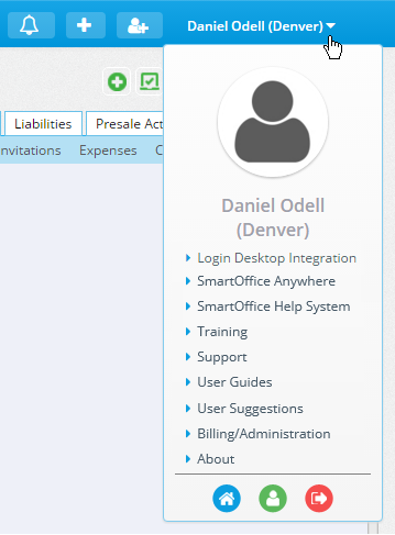 The profile menu is located in the upper-right corner of SmartOffice. To access it, click your name.