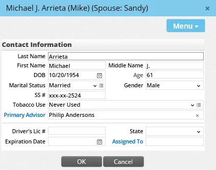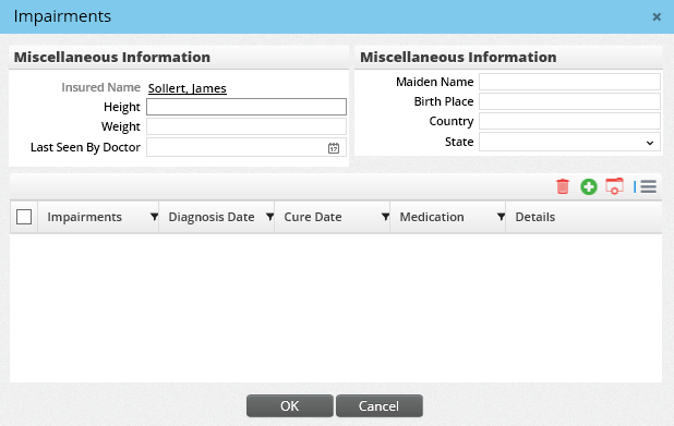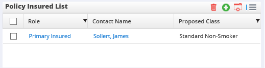 To view details about an existing insured contact, click the contact's name in the Policy Insured List. Adding Impairment Information for an Insured Contact
