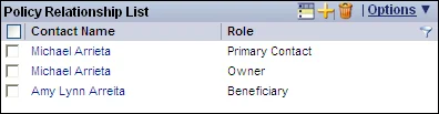 The Policy Insured List section of the Detail content link displays the primary insured and the other insured contacts for the policy. Adding an Insured Contact