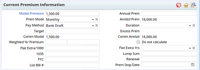 For detailed information about the fields and calculations in this section, see Life Policy Calculations. Note the buttons in the title bar of the Current Premium Information section: