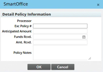 Click a policy number in the Policy Information section of the dialog box to view detailed information about the exchange. To note the amount along with the date it was received, click the New button in the Policy Information section to open the Detail Policy Information dialog box.