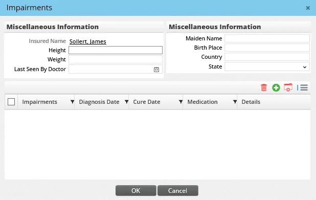 1. Click the Options button in the Policy Insured List and select Impairments to open the Impairments dialog box.