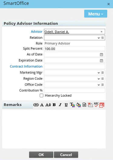 SmartOffice may create some entries in the Policy Relationship List automatically when the pending case is created, based on entries in the primary advisor's Policy Contacts list (located on the advisor's Key Relations content link).