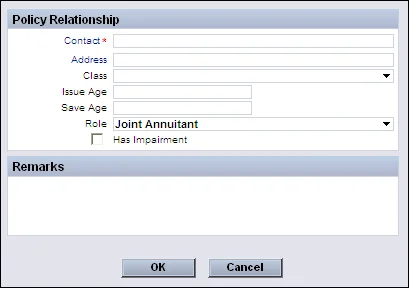 1. Click the New button in the Policy Annuitant List to open the Policy Relationship dialog box.