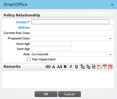 in the Policy Insured List and select New 'Policy Insured/Relationship' Record to open the Policy Relationship dialog box.