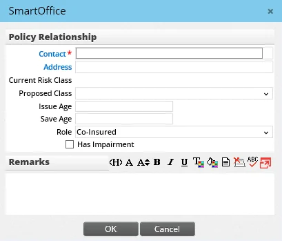 1. Click the Options button in the Policy Insured List and select New 'Policy Insured/Relationship' Record to open the Policy Relationship dialog box.