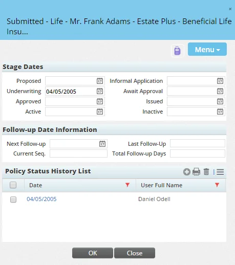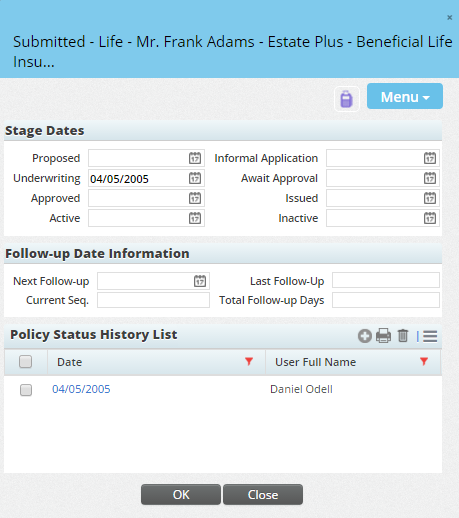 For more detailed status information, click the Status/Status Date hyperlink. A dialog box opens to display the case's stage and status date history, as well as any follow-up dates linked to the policy stage.