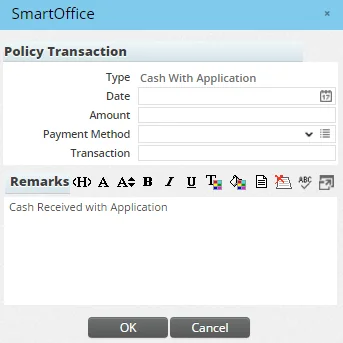 • Cash Received: This field refers to money accepted with the application. This information is stored as a policy transaction. The amount is displayed as a read-only field. To see more Cash Received information, click the Cash Received hyperlink to open the Policy Transaction dialog box.