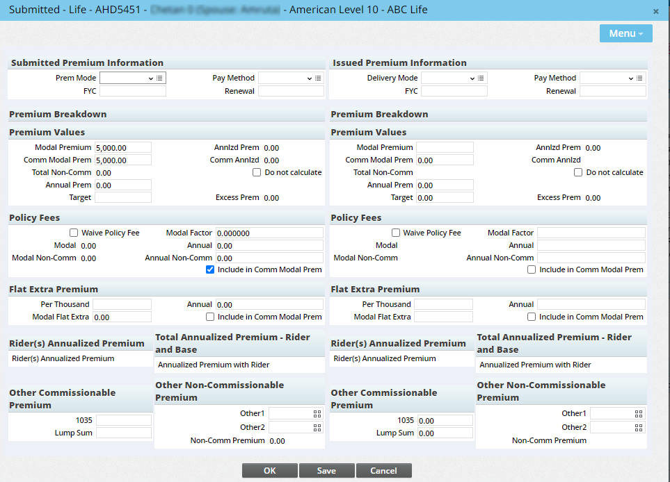 The Current Premium Information section contains details about proposed premium costs and payments. To view or modify premium breakdown information, click the Modal Premium hyperlink.