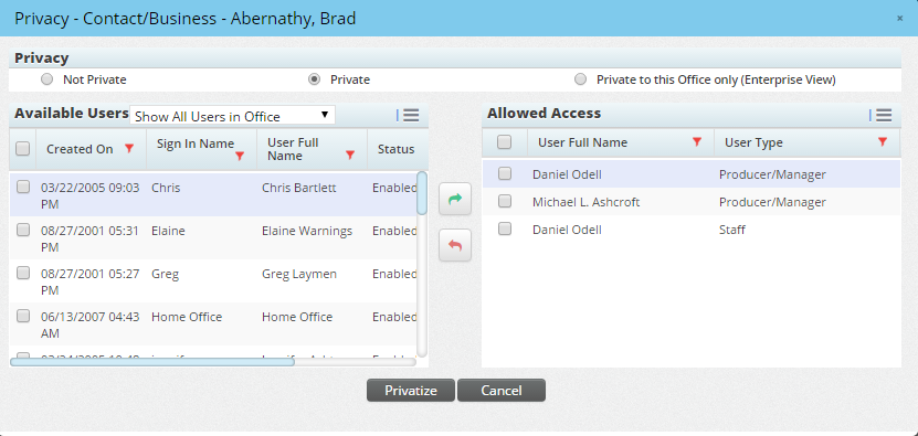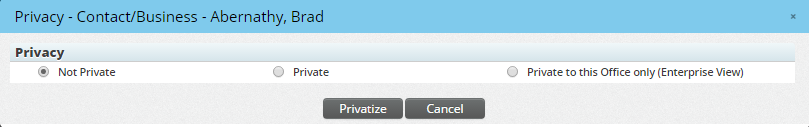 • Private to This Office Only (Enterprise View): This setting applies to offices that are part of an office hierarchy. Select this option and click the Privatize button to make the record visible only to users in the current office. The record will be invisible to Enterprise View users in higher offices.