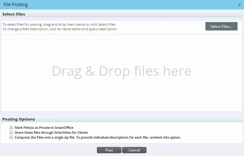 Once that option is enabled, users who try to post files to SmartOffice see the new File Posting dialog box, which features both drag-and-drop selection of files as well as a Select Files button for choosing the files to post.