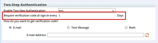 - Users can now tell the system to remember the last successful verification for a specified number of days. In User Preferences, on the 2-Step Authentication content link, users can enter the number of days in the new Require verification code at sign-in every \_\_ days field. For example, if the user enters a value of 5, the system will not ask for verification again for five days following a successful verification.
