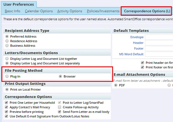 To switch to browser-based file posting, go to User Preferences > Correspondence Options and select Browser under the new File Posting Method section.