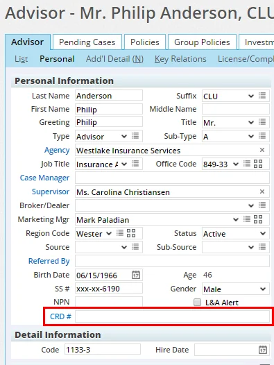 As part of this enhancement, users can now also track the CRD # using a new field on the advisor Personal content link (under Personal Information) and the agency Detail content link (under Business Information).