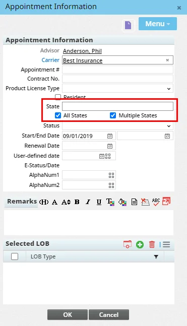 In advisor and agency appointment records, the options for editing state information have been revised for improved usability: