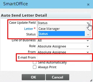 - Letters can now be configured to auto-send when a user updates the case manager (previously, only status updates could trigger an automatic letter). In the Auto Send Letter Detail dialog box, a new Case Update Field drop-down list enables the user to specify whether the letter applies to case manager or status updates.