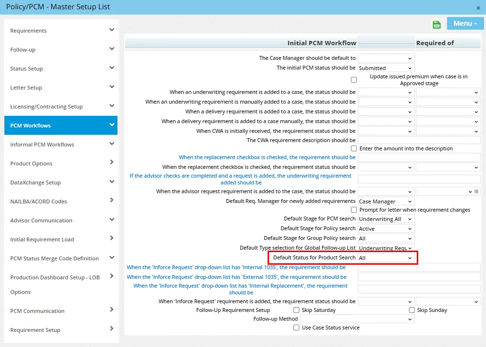 Administrators can now specify the status that will be selected by default when users in the office search for individual insurance product records. In Setup > Policy/Case Setup, navigate to PCM Workflows > Initial PCM Workflow to locate the new Default Status for Product Search option. Then choose Active, Inactive or All. to indicate the default.