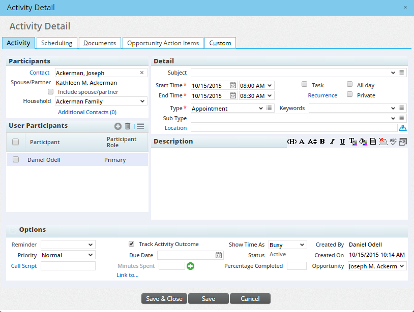 - Subject: The Subject field provides space for entering a brief description of the activity's purpose. If the user uses certain subject lines repeatedly when creating activities, the field can be customized to store those subject lines for quick use in the future.