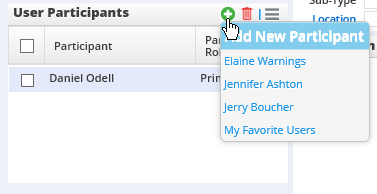 If the user has created a list of favorite users, any of those users can be added quickly to the participants list by pointing to the Add New Participant button to display a menu of favorite users.