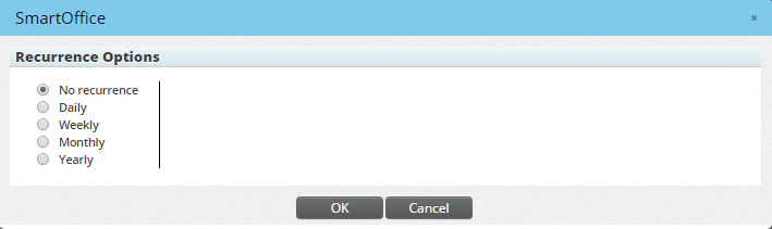 By default, the No Recurrence option is selected. When you select the Daily, Weekly, Monthly or Yearly option, new options and fields appear, including fields for entering start and end dates and for entering the number of times that the activity will recur before ending. The maximum number of recurrences allowed for an activity is 365. Once a recurrence pattern for an activity is created and saved, it cannot be modified.