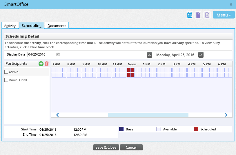The Scheduling tab lets you check the availability of other users in the office and schedule an activity for a time when all participants are available.