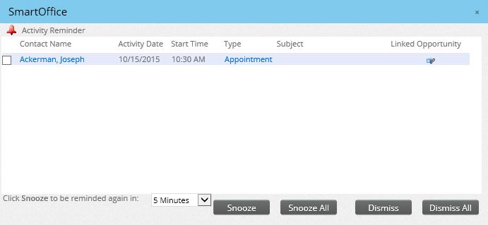 - Snooze/Snooze All: Select one or more activities, and then click the Snooze button to close the Reminder dialog box. The dialog box will appear again after the time interval specified in the drop-down list. The available snooze intervals range from five minutes to two weeks. To snooze reminders for all listed activities without having to select them first, click the Snooze All button. Reminders for all of the listed activities will display again after the specified snooze time interval.