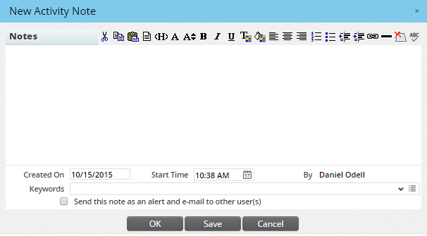 To enter general notes about the activity, click the New Activity Note button and enter your notes in the New Activity Note dialog box.