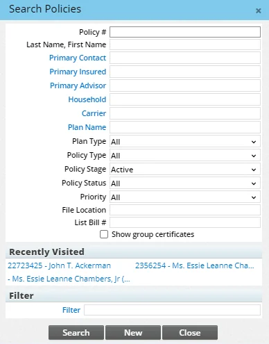 1. Select Policies from the expanded Insurance menu to open the Search Policies dialog box.