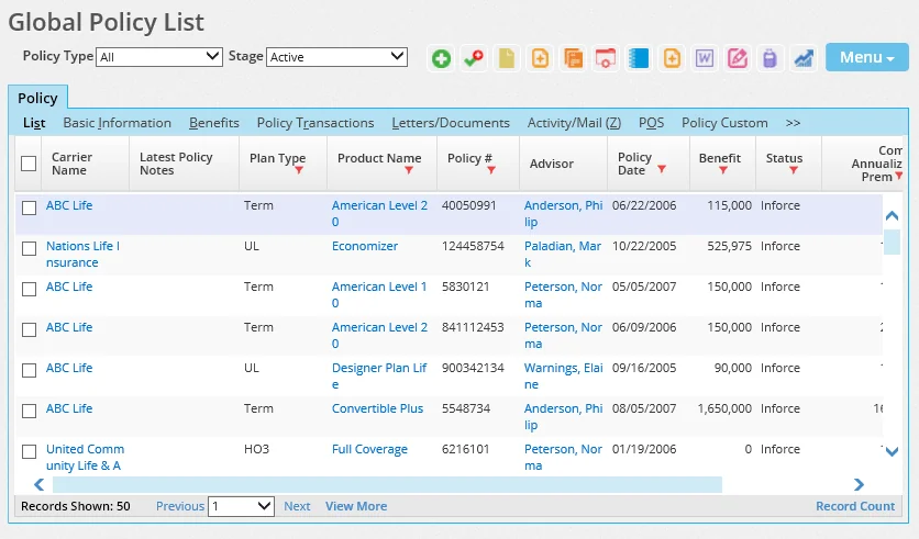 If more than one record is found during a policy search, the results are displayed in the Global Policy List.