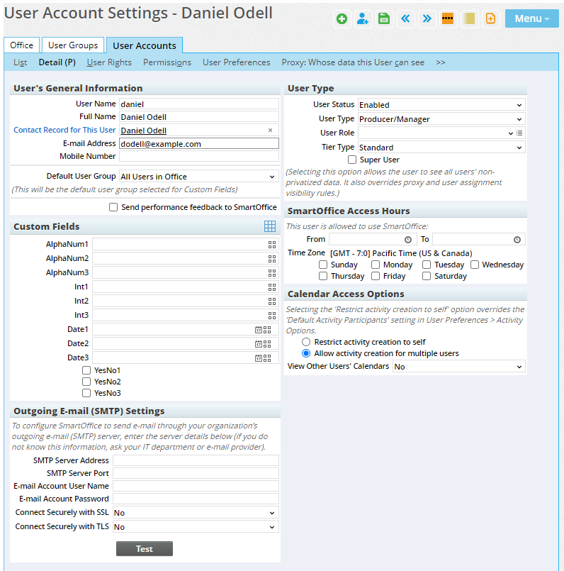Individual user accounts can have their own outgoing e-mail settings that override any outgoing e-mail settings configured on the office Detail content link. This capability can help in some situations where e-mails sent from SmartOffice (e.g., automatically e-mailed Dynamic Reports and advisor commission statements) are ending up in recipients' junk e-mail folders.