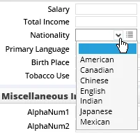 A drop-down list is a field that the user clicks to display one or more available options. An example is the Nationality field on the contact Add'l Detail content link.