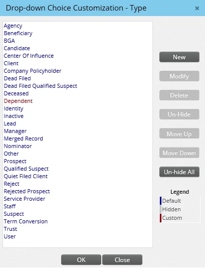 The default SmartOffice system choices are displayed in blue text, while custom choices (i.e., those added by users) are displayed in red. Hidden items are displayed in gray.