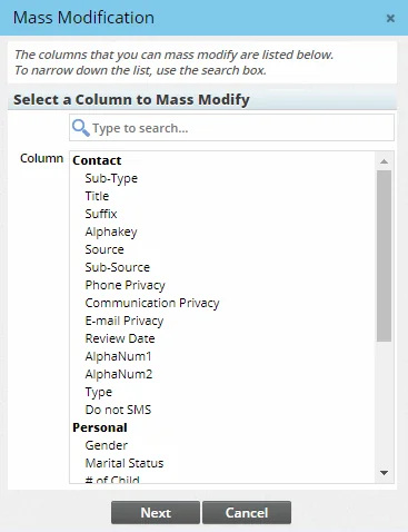 - Select a column from the list. The columns available will vary depending on the type of records being modified.