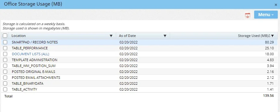 • As of Date: The date when storage statistics were last calculated for the office. The amount is calculated monthly.