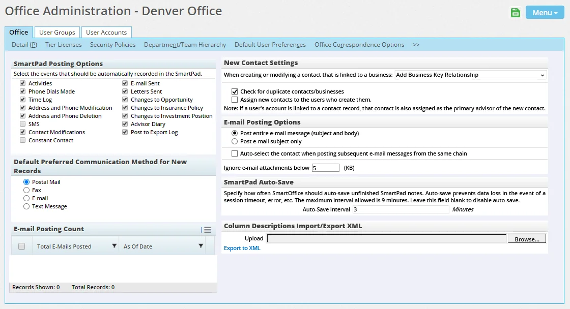 Office Settings - SmartPad/New Contact/E-mail Posting