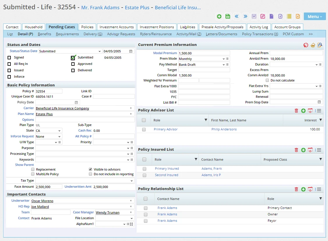 When viewing a pending case, the user can access this content link to review and/or edit policy-specific information such as Policy #, Carrier, Plan Name, Plan Type, Premium and Mode, along with Advisor Information, Important Contacts (Underwriter, HO Rep, Team and Agency Rep) and Policy Relationships.