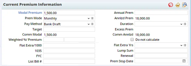 For detailed information about the fields and calculations in this section, see Life Policy Calculations. Note the buttons in the title bar of the Current Premium Information section: