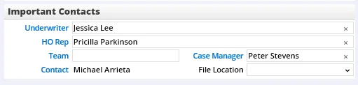 The contacts available for selection in the Underwriter and HO Rep fields are specified on the carrier's HO Reps/Underwriters content link. The File Location drop-down list specifies the unit within the organization that has been assigned to handle the case.