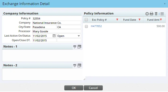 Click a policy number in the Policy Information section of the dialog box to view detailed information about the exchange. To note the amount along with the date it was received, click the New button in the Policy Information section to open the Detail Policy Information dialog box.