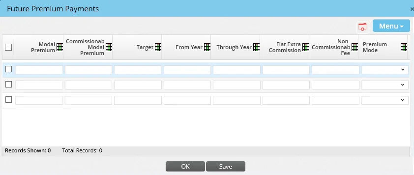 • Future Payment: The Future Payment button opens an editable spreadsheet that can be used to record future premium payments for a policy whose modal premium changes over time. The SmartCommissions module uses this information to calculate accurate commission projections for such policies.