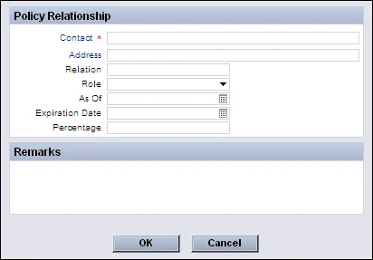 • Relation: The relationship the contact has with the policy's primary insured. - Role: The contact's relationship to the case.