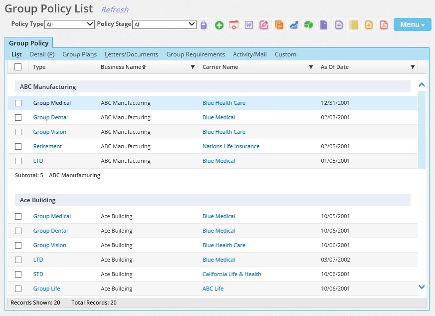 Learn more about working with lists in SmartOffice. Note: If only one policy matches the search, that record opens directly.