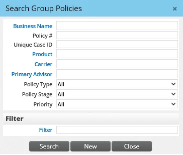 - To find a specific group policy, enter criteria such as the policy number, carrier, policy type and policy stage to narrow down the search. (The default policy stage for group policy searches can be defined in Policy/Case Setup